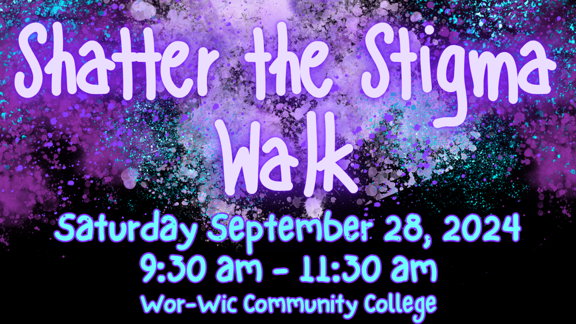 Join Wicomico Goes Purple, Wor-Wic Community College, Walk Wicomico and the Wicomico County Health Department as they hold their third annual Shatter the Stigma Walk on September 28, 2024 from 9:30 a.m.-11:30 a.m. at Wor-Wic Community College. This event is family friendly, and the 1 mile walking path will be ADA and stroller friendly. The first 150 participants to register will get a FREE t-shirt the day of the event. Here is the link to register https://forms.gle/u2PeHsHx6KVgC9Vo7