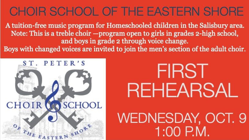 St. Peter's Episcopal Church 115 St. Peter's St., SalisburyThe Choir School of the Eastern Shore will meet Wednesdays at 1pm in St. Peter’s Choir Room under the direction of Music Director James Wallace. There has been interest by the Homeschooled community in participating and so the school’s hours will be compatible with their school day, although it is open to all youth. This…