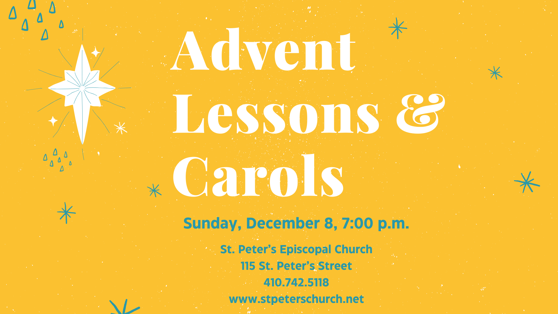 St. Peter's Episcopal Church 115 St. Peter's St., Salisbury, MD, United StatesSt. Peter’s Episcopal Church will host a candlelight service of Advent Lessons and Carols on Sunday evening, December 8 at 7 p.m. Originating in Anglican churches in the 19th century, the service of Advent Lessons and Carols features nine scripture lessons, each followed by an Advent carol or choral piece. All are invited to participate…