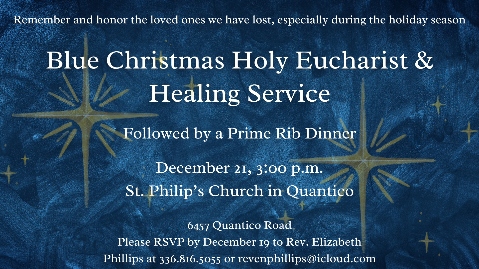 St. Philip's Episcopal Church 6457 Quantico Rd., Quantico, MD, United StatesA Blue Christmas Holy Eucharist & Healing Service will be held this year on December 21 at 3:00 p.m. at St. Philip’s Church, 6457 Quantico Road in Quantico. The Christmas season can be a very difficult time for those who have lost a loved one over this past year or have lost a significant relationship…